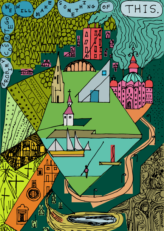 While using hands as a metaphor for balancing abilities, they are also a central element in the picture. It is not apparent that the central figure can see all the elements around him. However, he is reaching and trying to feel his way in a world with many moving elements. In a broad sense, this is also what art allows us. That is, to feel with all our limitations, and reach for a higher order.